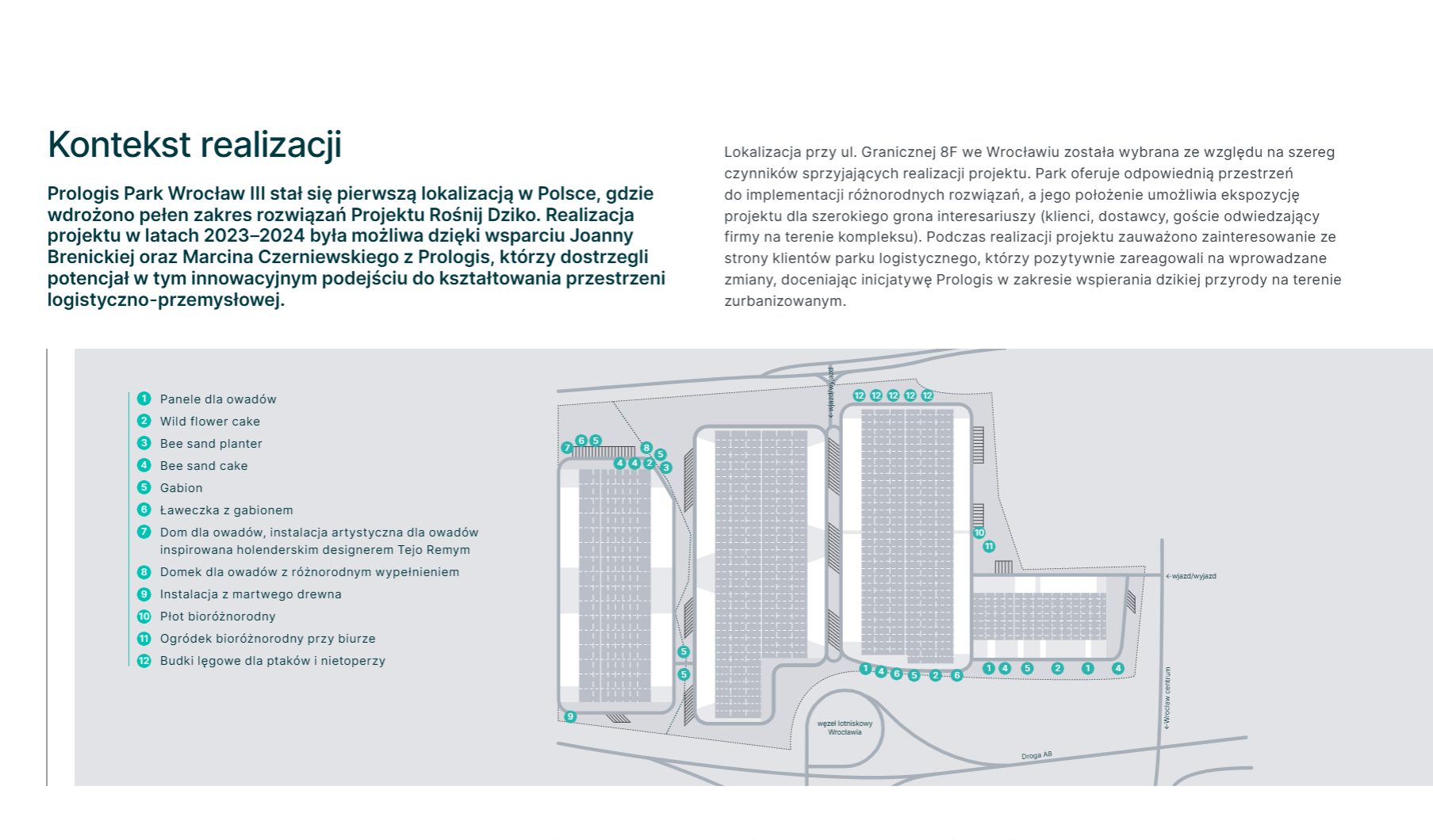 Raport analizuje wdrożenie innowacyjnego projektu „Rośnij Dziko” w Prologis Park Wrocław III jako przykład praktycznej realizacji zobowiązań firmy w zakresie zrównoważonego rozwoju i ochrony bioróżnorodności. Projekt, realizowany w latach 2023–2024, wprowadza nowatorskie rozwiązania wspierające bioróżnorodność w przestrzeni logistyczno-przemysłowej. Raport dokumentuje nie tylko techniczne aspekty wdrożenia, ale także długofalowe korzyści dla środowiska, społeczności lokalnej oraz samej firmy.